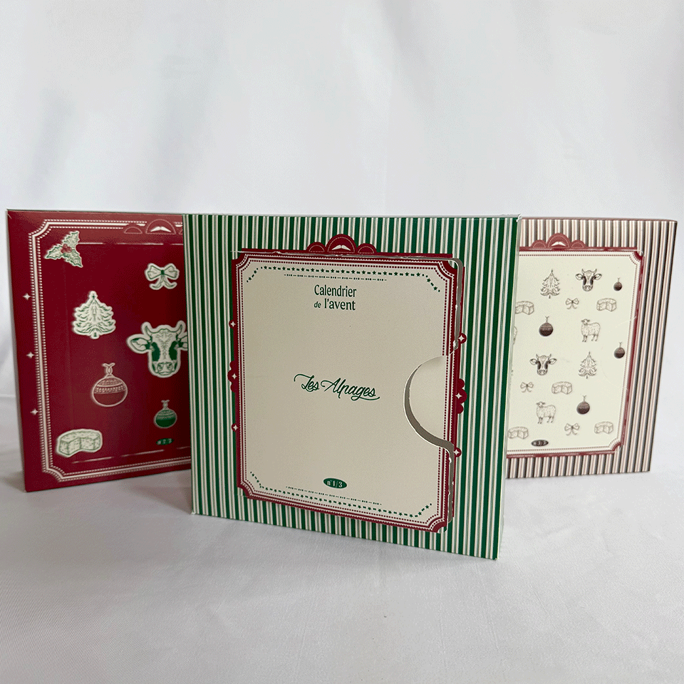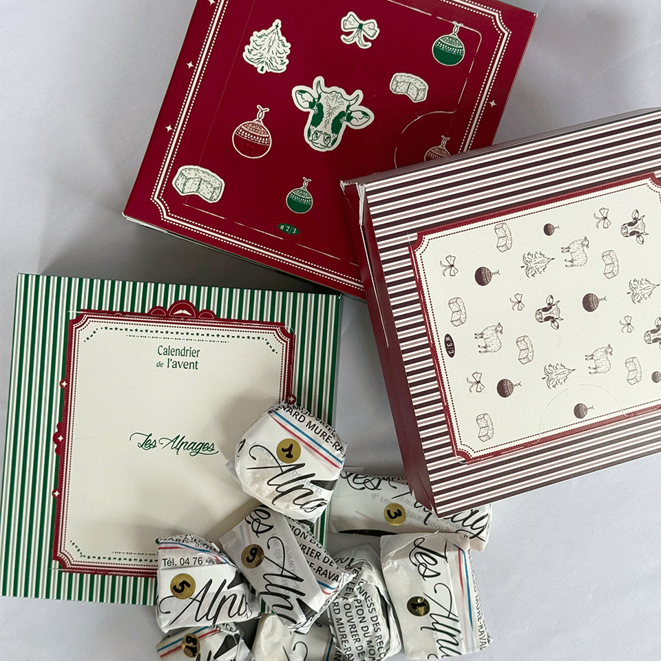 Pour ce projet, l'enjeu était de réinterpréter l'imagerie traditionnelle des fêtes de fin d'année sans trahir l’identité visuelle de la Fromagerie Les Alpages. Nous avons privilégié une palette et des formes évoquant les fêtes, tout en adoptant un traitement graphique contemporain. L'identité visuelle de la fromagerie a été intégrée au cœur du packaging. Nous avons décliné ses codes graphiques habituels (typographies, logos, univers de marque) pour assurer une reconnaissance immédiate du client, tout en l'adaptant au format spécifique du calendrier.